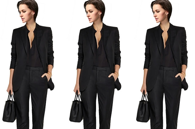If you like classic style, this is the look for you – two piece black, fitted suit with shorter, collared blazer and stretchy trousers. This cut will look very flattering and feminine on you. Take your favorite white blouse and tuck it underneath the pants for a more formal look. You can add a belt to take it on another level.